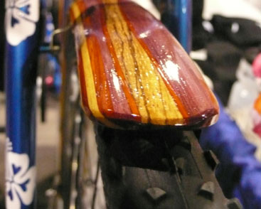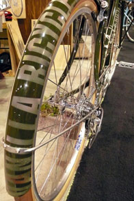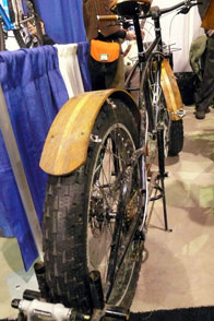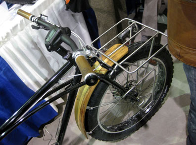 This bike from Banjo was another example of compound curved wooden fenders. The racks were really pretty and used a structural branch and leaf pattern. The water bottle cages were carbon fiber wrapped with a veneer of the same wood used in the fenders.