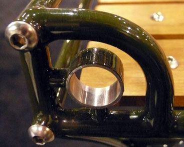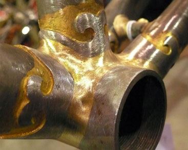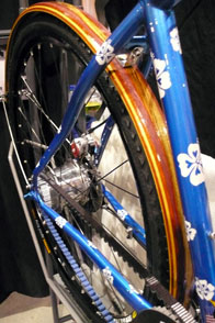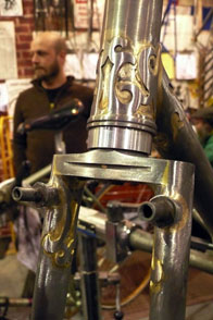 This beautiful Bilenky frame with custom lugs was left unpainted to show off the brazing and lug work. To me, this is the essence of what custom bike shows are about, and just some lovely work. I like how the color of the brass accents the edges of the lugs.