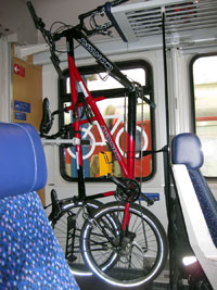 We purchased tickets for the two of us with reserved seats and for one (single) bike. The car was open seating with single bike spots on each end of the car. We didn't tell them it was a tandem, and had a hard time getting it in, but stuffed it in and were finally on our way! Without the front wheel, the tandem just cleared the ceiling when held vertically, but that wasn't the hard part. The toughest was getting it in the car through the narrow door, then making a 90 degree turn into the seating area. We wanted to do it quickly, for fear that a conductor might see our struggle. Then we'd have to wait a couple of days for the train that had the bike storage car that could accomodate tandems.