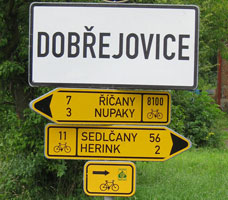 Once you leave the confusion of Prague, the signage becomes pretty consistent. The top sign in the picture to the left indicates that you are entering the town of Dobřejovice. The next two down indicate that bike route 8100 goes left and route 11 goes right, with distances in km to the listed towns. The bottom sign is a Prague-Vienna Greenway sign. In this stretch, the Greenway is following bicycle route 11. Occasionally, you'll see blue rectangular signs with different km distances to the same towns. In those cases, the distance on the bike route signs is the distance following the bike route, and the blue rectangular signs are distances for motorized vehicles following the main roads.