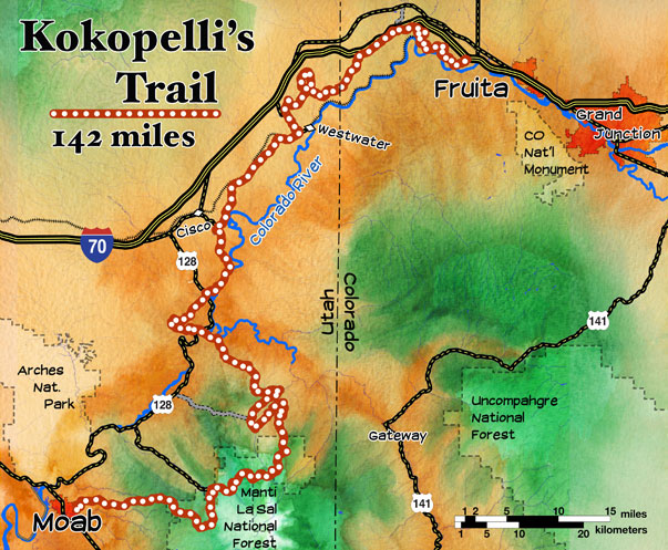 I have not been on Kokopelli's Trail but I have traveled through the area several times, most recently in the summer of 1998 while doing some field work for the USGS. The area is one of the most spectacular in the U.S. Several national parks and national monuments are in the area including: Colorado National Monument, Canyonlands National Park, and Arches National Park.
