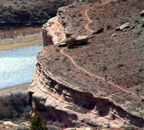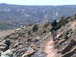 Segment 6, mile 11.0 - Singletrack begins again and climbs through the steep, maroon shale slopes of the Morrison formation, high above the Colorado River. This stretch is rated difficult with a good deal of exposure.