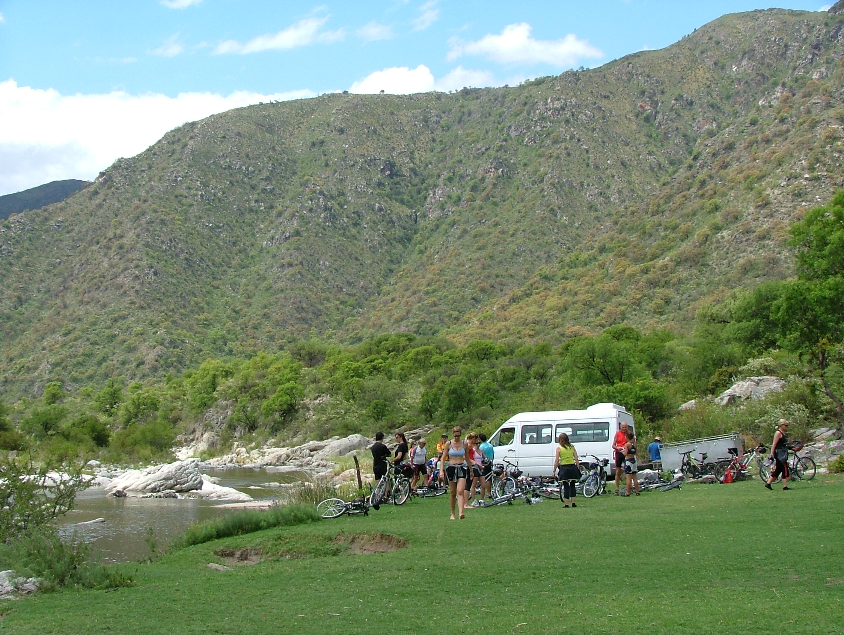 After settling into our rooms, we loaded back into the vans and shuttled to La Cumbre where it was finally time to don our helmets and gloves and get the pedals turning. We began our ride on a wide gravel road that eventually led us to “Cuchi Corral:” A beautiful panoramic point 1100 meters above sea level, and a launch point for paragliders and hang gliders. As we looked hundreds of meters down into the valley, we could see the road ahead of us, the Rio Pintos, and our eventual lunch spot.
